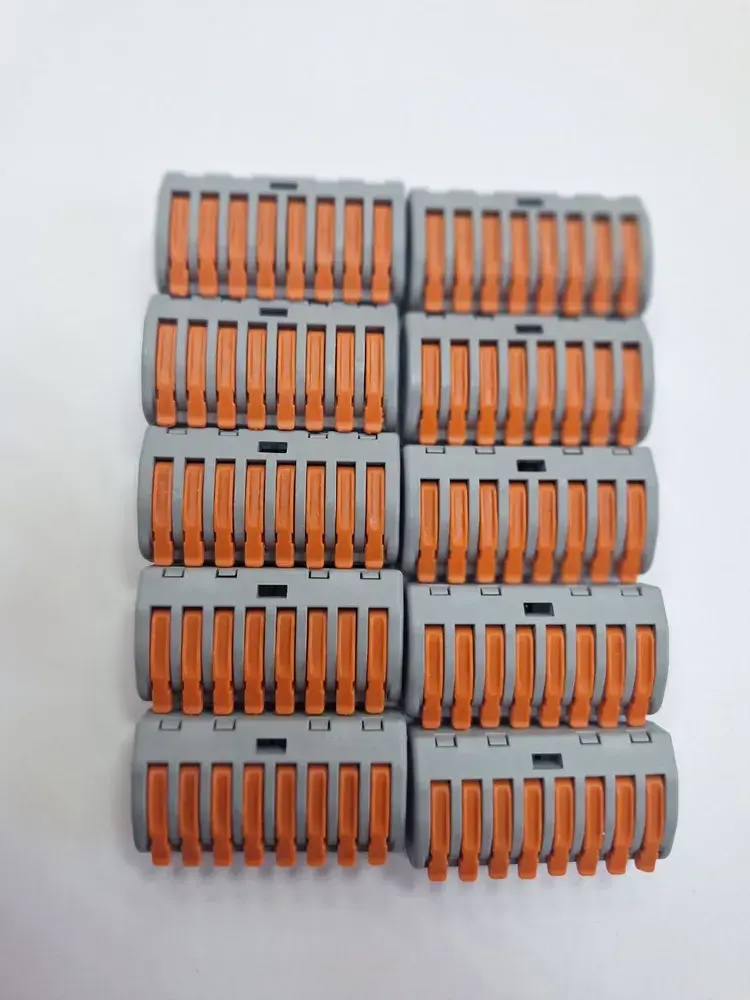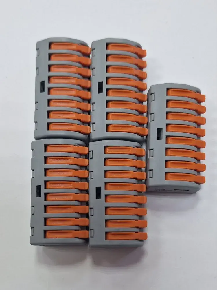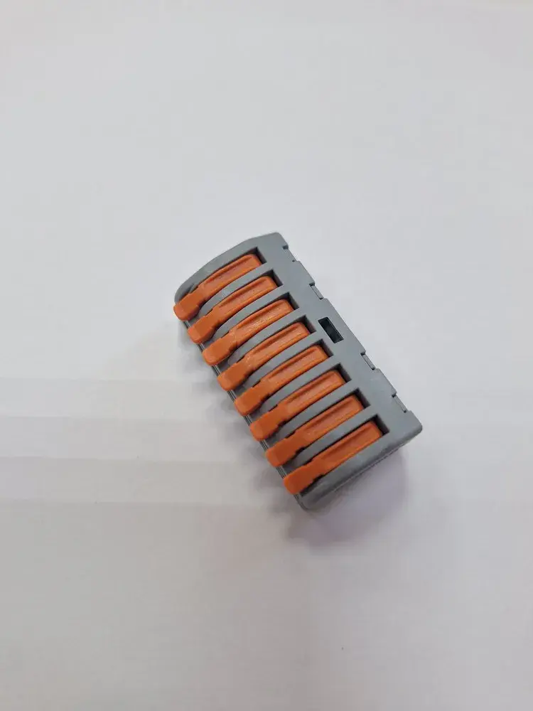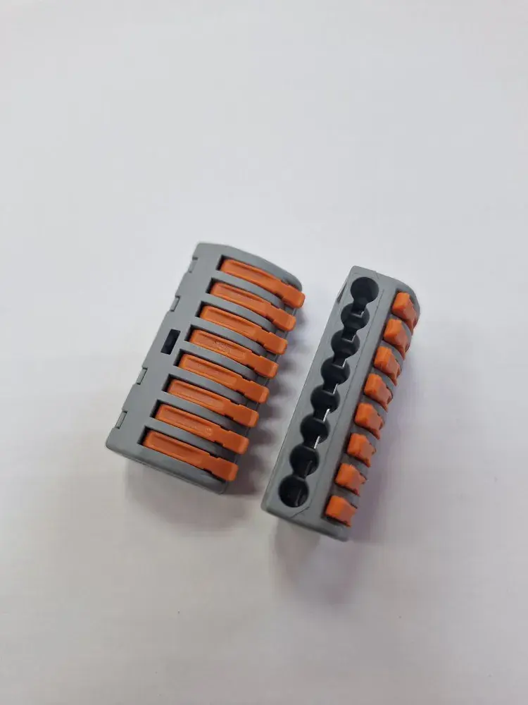 СМК-418 — компактная быстросъёмная клемма с восемью независимыми контактами, предназначенная для аккуратного и надёжного подключения проводов в распределительных коробках и электрощитах. Рычажный механизм позволяет выполнять монтаж без инструмента и обеспечивает стабильное соединение при вибрациях и нагрузках. Клемма рассчитана на ток до 32 А и напряжение до 415 В, подходит для проводников сечением 0,08–4 мм². Корпус изготовлен из прочного изолирующего пластика, а контактные элементы — из лужёной меди, что гарантирует долговечность и безопасность эксплуатации.