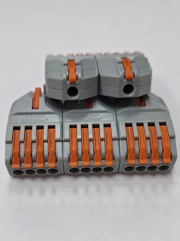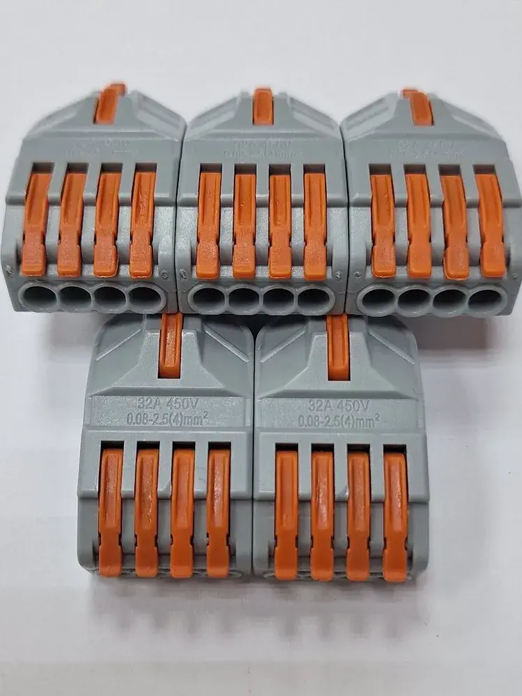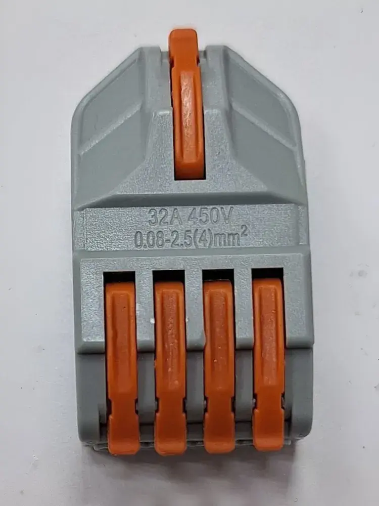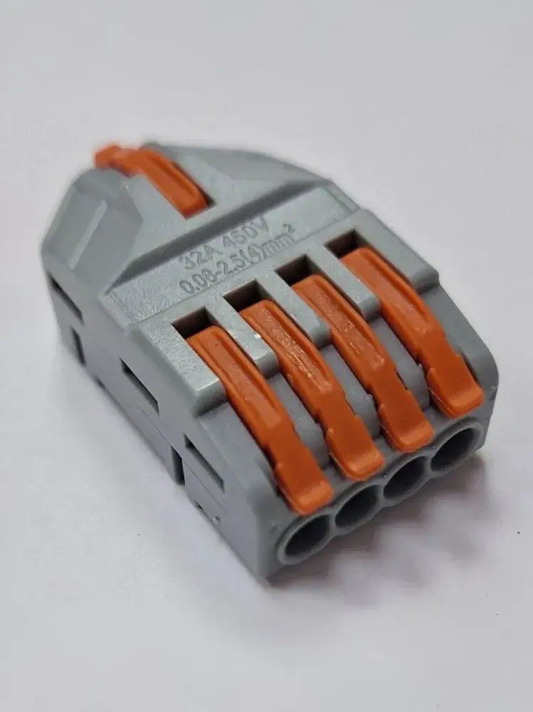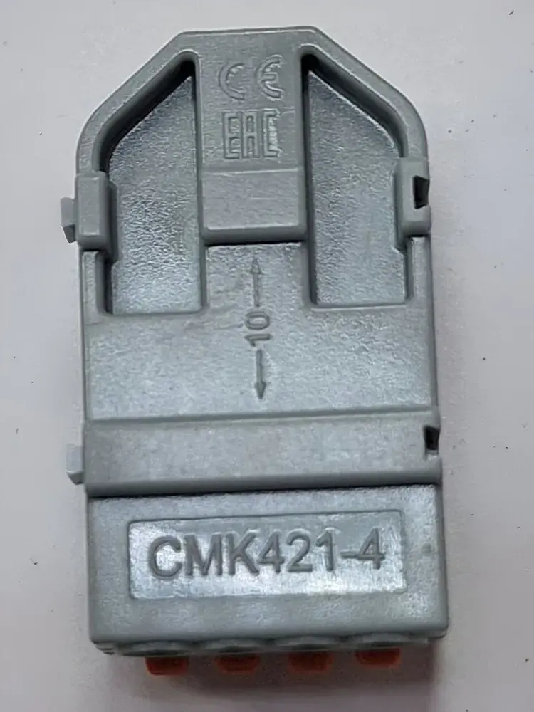 СМК-421-4 — компактная быстросъёмная проходная клемма с рычажным механизмом, предназначенная для надёжного соединения проводов в распределительных коробках и электрощитах. Конструкция имеет 5 контактов (4+1), что позволяет выполнять параллельное подключение и объединять несколько линий в одной точке. Клемма рассчитана на ток до 32 А и напряжение до 450 В, подходит для проводов сечением 0,08–2.5 мм². Прочный изолирующий корпус и лужёные медные контакты обеспечивают стабильное соединение и безопасность в эксплуатации. Предусмотрена возможность соединения нескольких клемм между собой.