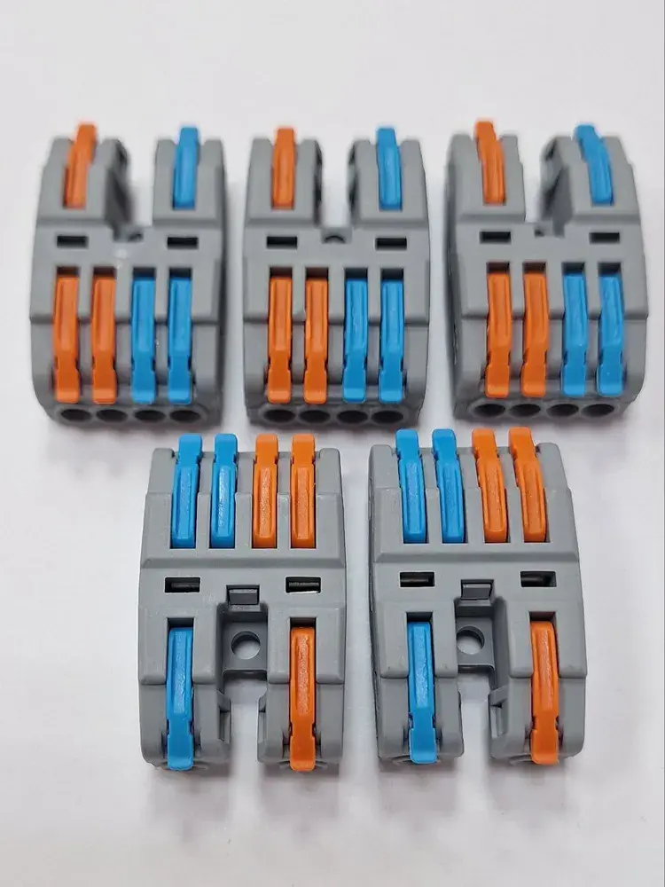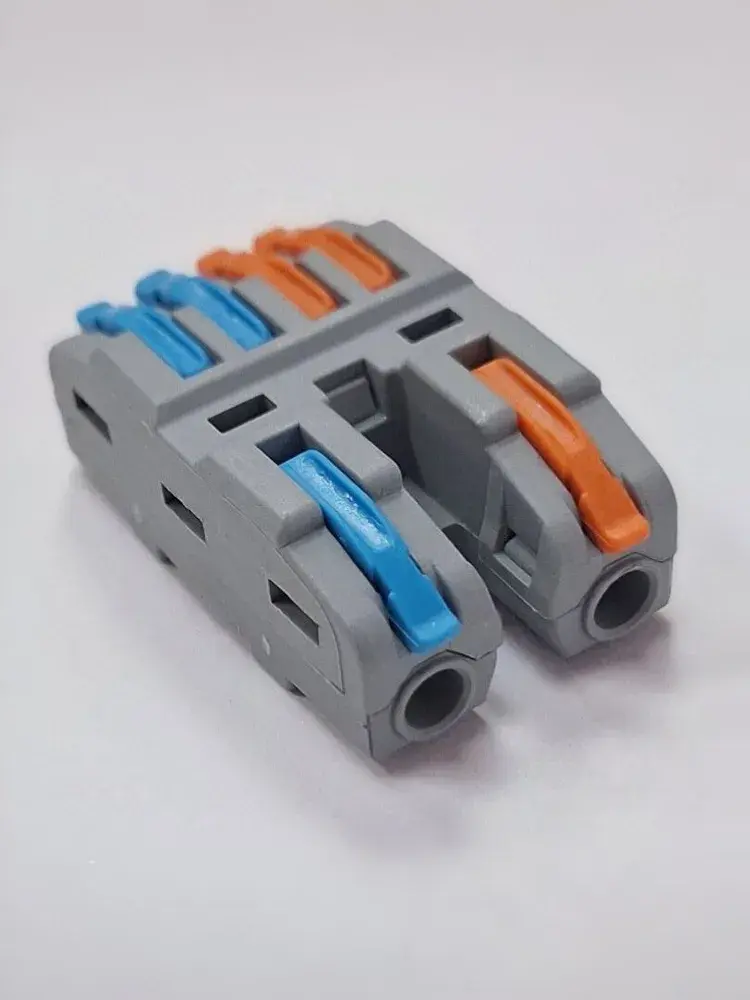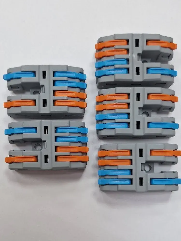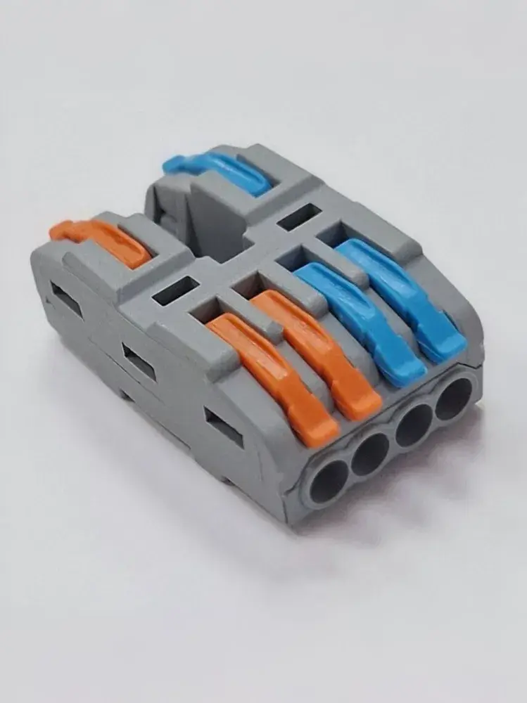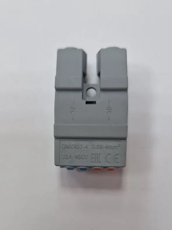 СМК-422-4 — компактная проходная быстросъёмная клемма, предназначенная для надёжного и удобного подключения проводов. Конструкция включает 2 полюса / 6 контактов (2+4), что позволяет распределять линии и выполнять параллельные соединения в электрощитах и коробках. Рычажный механизм обеспечивает быстрый монтаж без инструмента и гарантирует стабильный контакт при нагрузках. Клемма рассчитана на проводники сечением 0,08–4 мм², выдерживает ток до 32 А и напряжение до 450 В. Прочный изолирующий корпус и лужёная медная контактная группа обеспечивают долговечность и безопасность в эксплуатации. Предусмотрено отверстие для крепления винтом или саморезом.